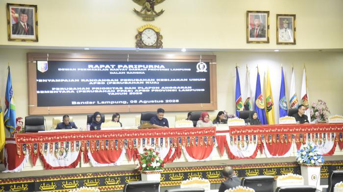 Bandar Lampung, RD – DPRD Provinsi Lampung menggelar Rapat Paripurna Penyampaian Rancangan Perubahan Kebijakan Umum Anggaran dan Prioritas Plafon Anggaran Sementara (KUA-PPAS) Tahun Anggaran 2025 serta Rancangan KUA-PPAS Tahun Anggaran 2026, Selasa (5/8/2025).