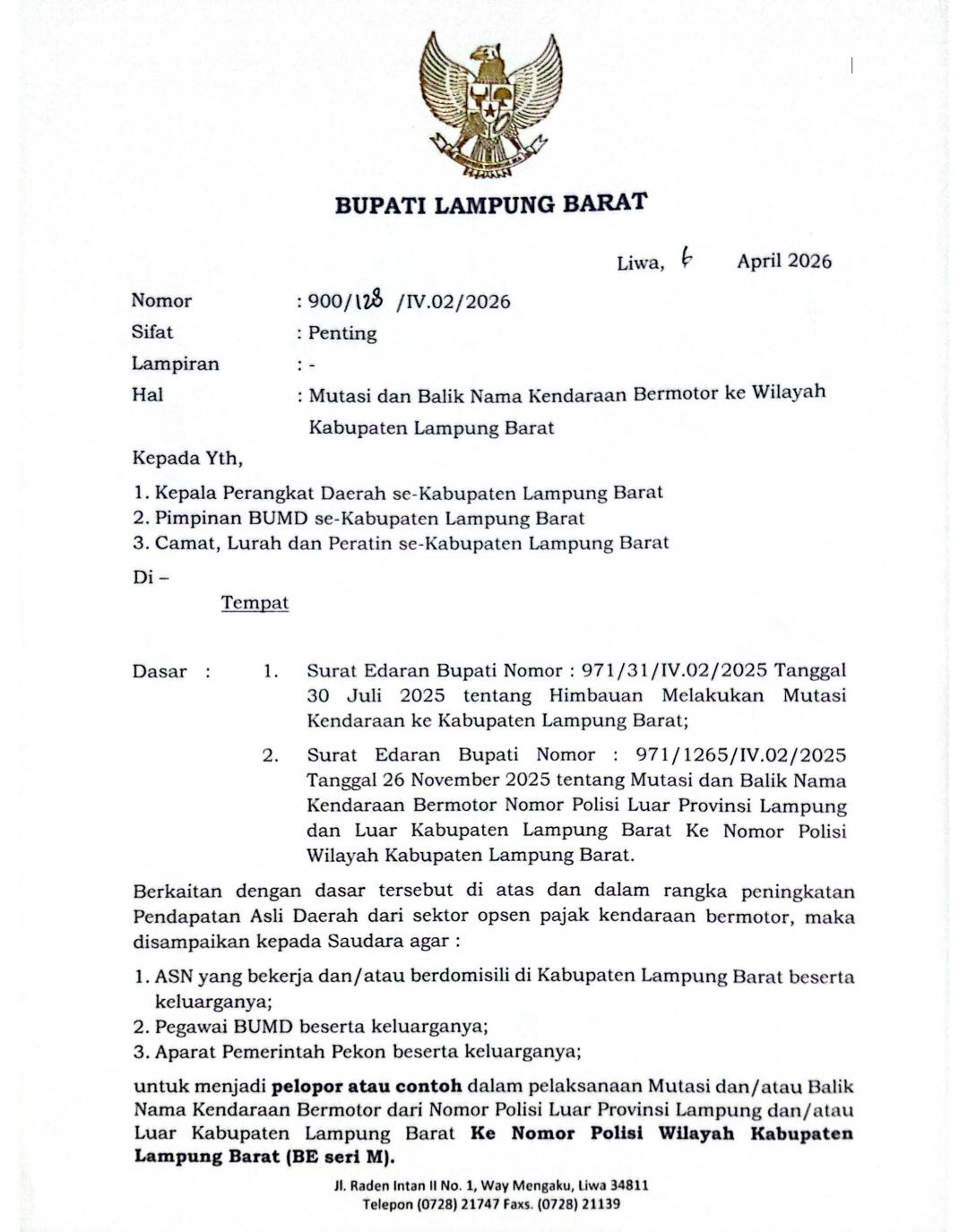 “Melalui kebijakan ini, saya mengajak seluruh ASN, pegawai BUMD, serta aparatur pemerintah pekon untuk menjadi pelopor dalam melakukan mutasi dan balik nama kendaraan. Ini bukan hanya soal administrasi, tetapi bentuk kontribusi nyata dalam membangun Lampung Barat,” ujar Parosil.